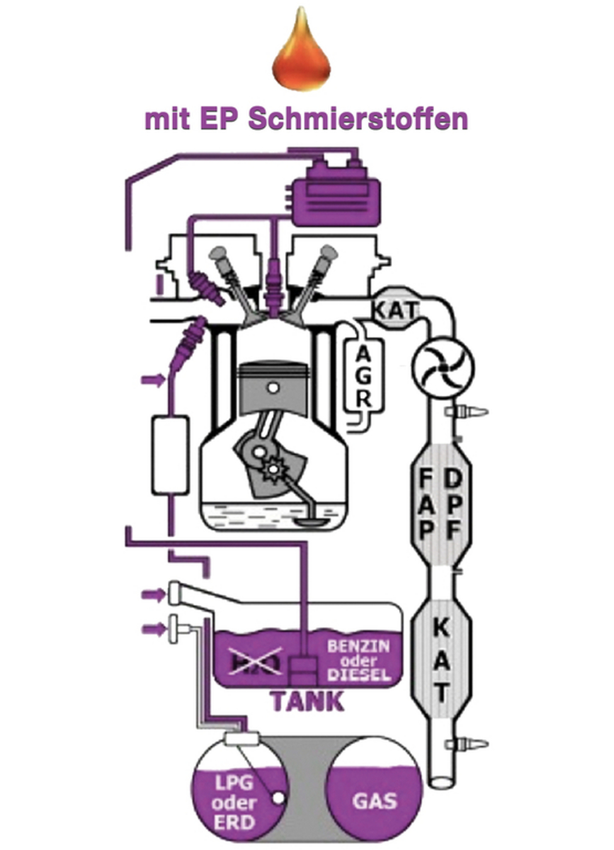 Bei Erdgas/Benzinmotoren sollten ebenfalls bei jedem Service 150 ml vb35 über den Einspritzventilensammler zugeführt und die restlichen 150 ml über den Benzinbehälter beigemischt werden.